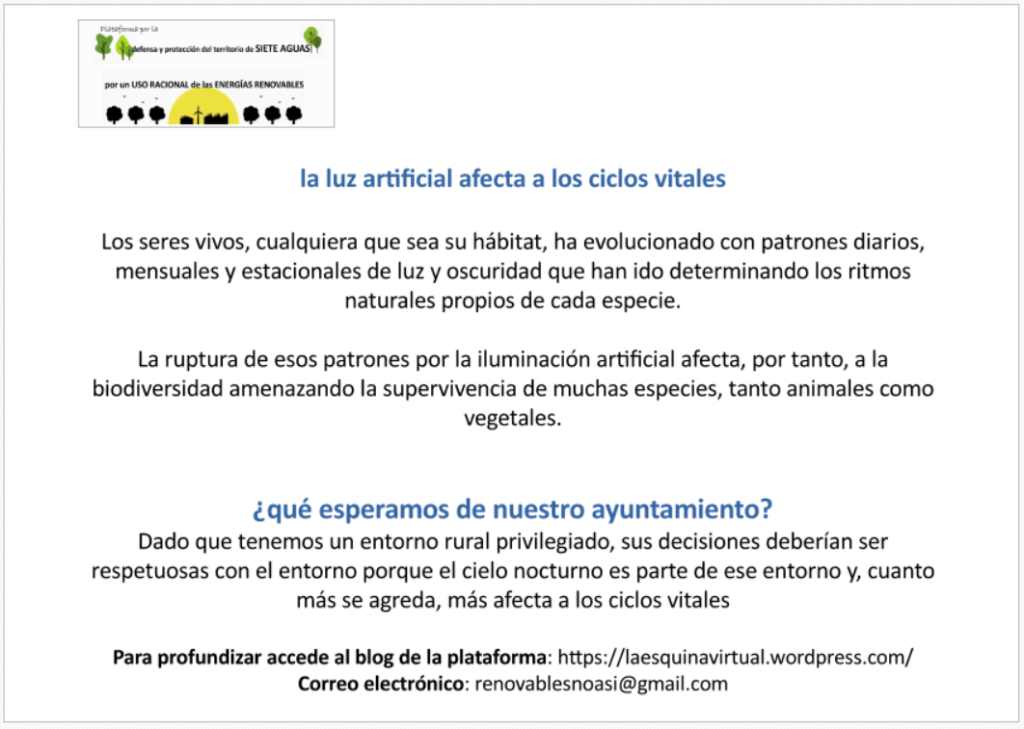 Igualmente general, pero más amplio y sesudo, para quienes quieran profundizar un poco más, está el artículo aparecido en la Revista del Colegio Oficial de Físicos titulado ‘La gestión de la contaminación lumínica y su impacto sobre la biodiversidad’ (se encuentra en la página 12 del reportaje) y que podréis encontrar en la web de la Asociación contra la contaminación lumínica Cel Fosc.