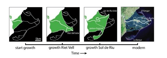 La siguiente, es una imagen de la evolución del delta del Ebro que decrece por la falta de sedimentos que se quedan en los embalses aguas arriba, por el ascenso del nivel del mar y la salinización de los acuíferos que restan aportación de agua dulce tan necesaria para la vida del delta.
