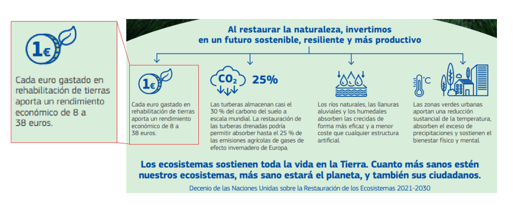 En 2021, el Parlamento Europeo elevó a la Comisión Europea (el órgano de gobierno de la UE) la Resolución sobre la Estrategia de la UE sobre la biodiversidad de aquí a 2030. en la que, en su punto 159, se respaldaba la política de restauración expresada en el “Decenio de las Naciones Unidas sobre la Restauración de los Ecosistemas (2021-2031) y pide a la Comisión y a los Estados miembros que integren efectivamente la protección del medio ambiente y la biodiversidad en todas las acciones exteriores”.