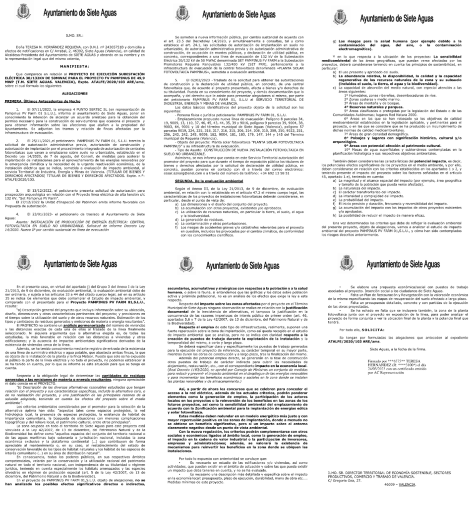 Como se puede apreciar, se afea al ayuntamiento por presentar alegaciones que deberían haberse presentado en la primera información pública en noviembre de 2021 y no ahora que se refería a una modificación en la línea eléctrica de evacuación.