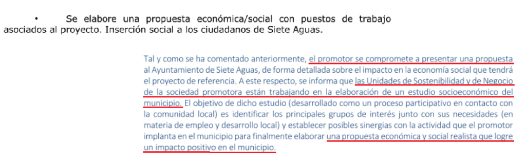 No hay nada, ni en el proyecto presentado ni en las promesas de la empresa que lo propone que asegure un beneficio para el pueblo.