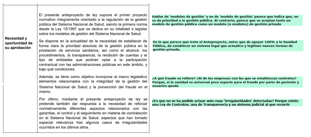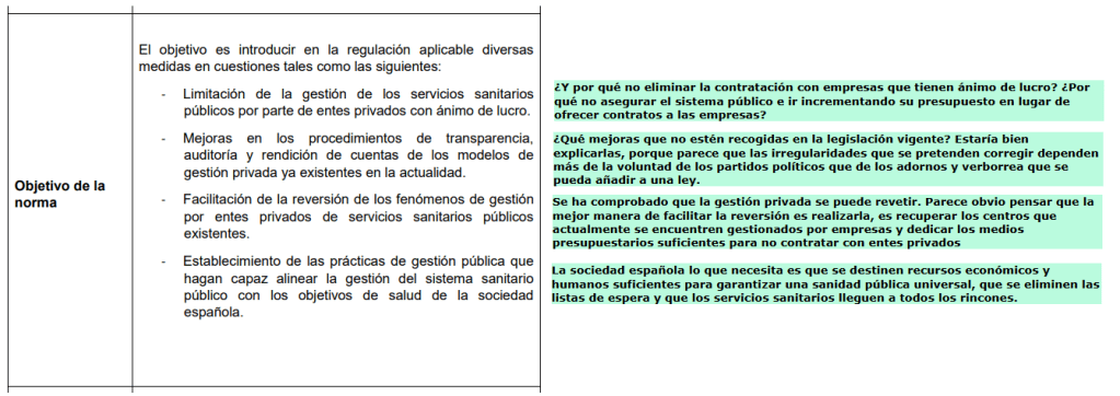 En la columna de la izquierda el texto que nos presenta el Ministerio para la consulta. A la derecha, en verde, algunas explicaciones complementarias.