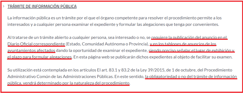 Uno de los pasos mencionados es el de ‘información pública’, pero no todos los procedimientos administrativos lo consideran necesario. En cualquier caso, de considerarse reglamentario, se especifica mediante ‘documento público oficial para que no haya dudas en caso de reclamaciones’.